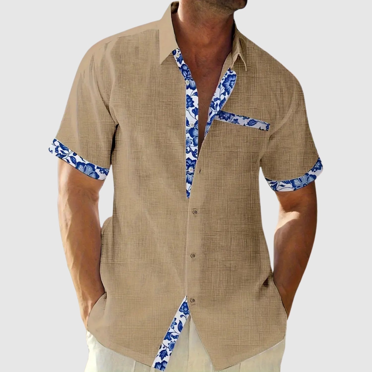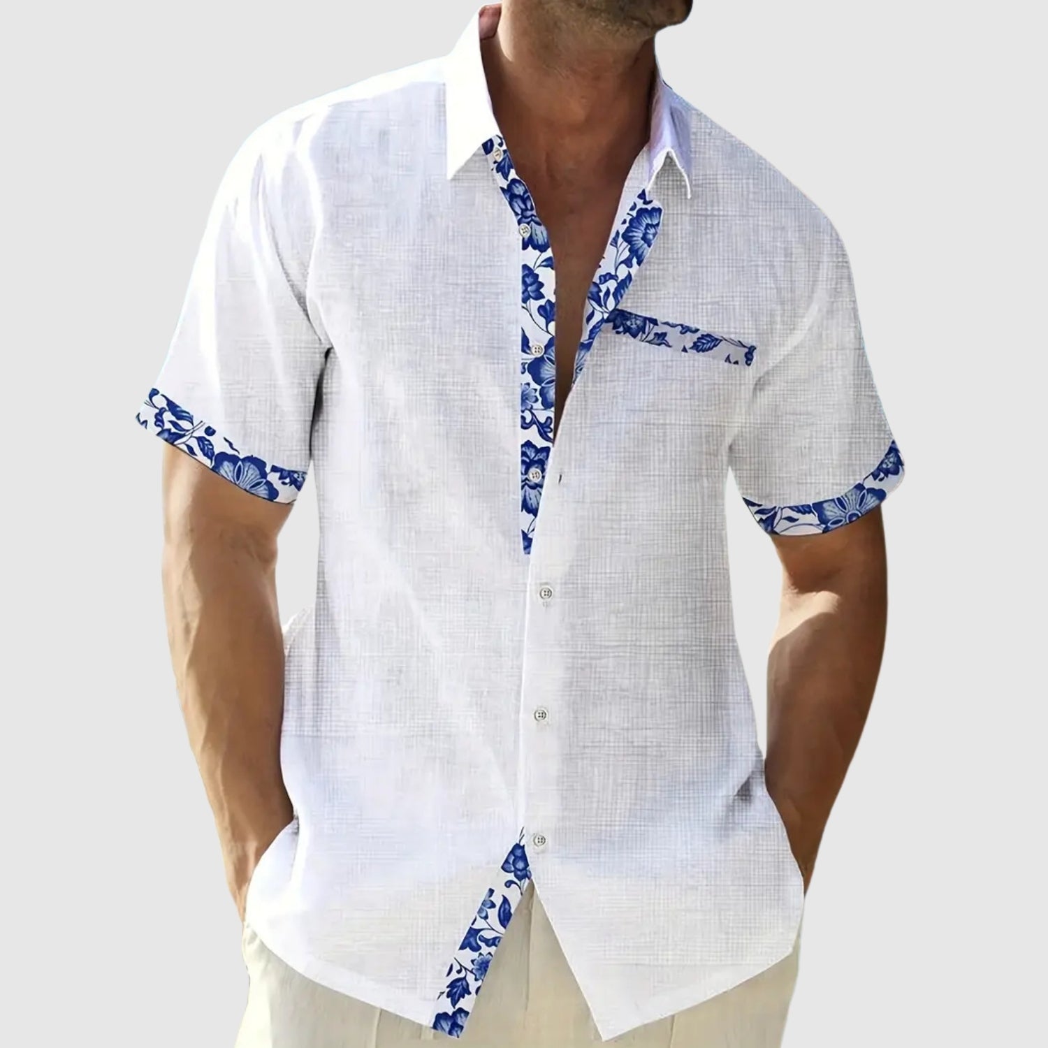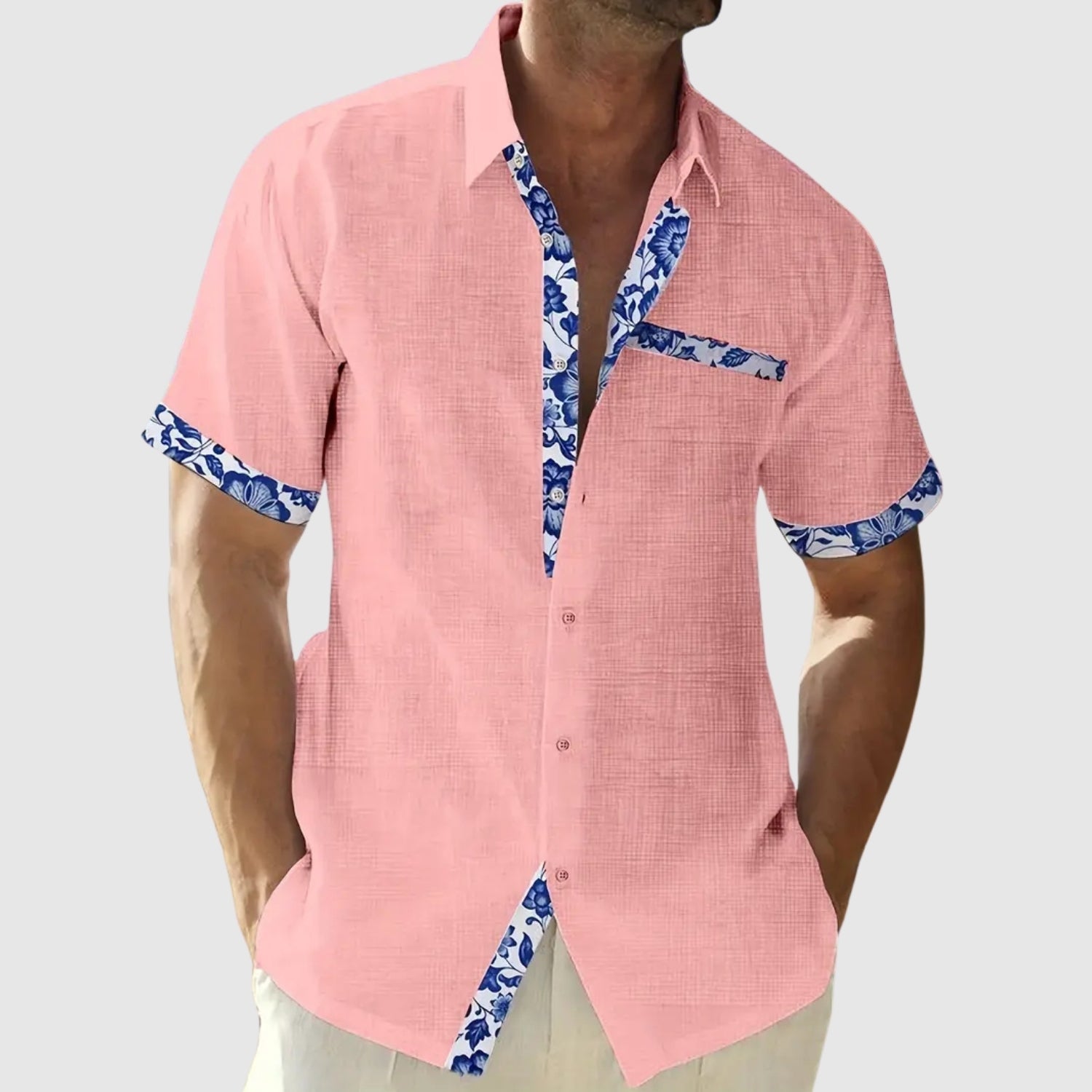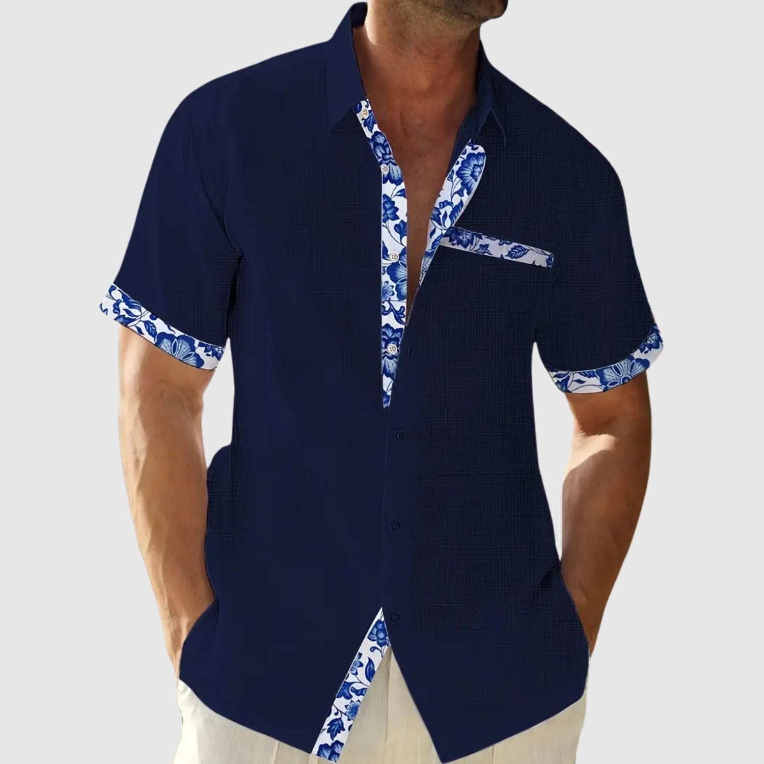 Ez a rövid ujjú ing, amelyet napos napokra terveztek, a frissességet és az eleganciát egy csipetnyi élettel ötvözi. A kontrasztos részletek, mint a gallér, zseb és ujjak, karaktert adnak a laza megjelenésnek, amely ideális a strandra, a városba vagy nyári utazásokra.