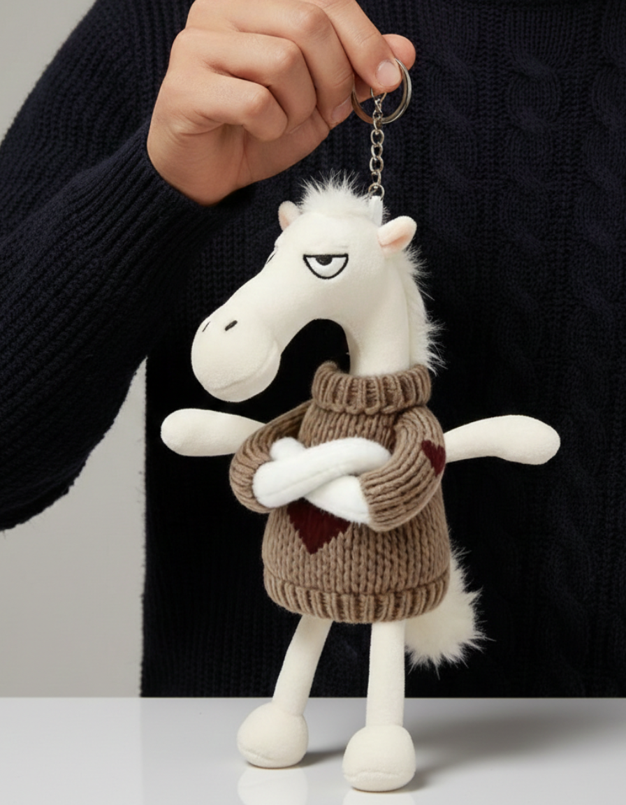 Fedezd fel a Merész ló kulcstartót, a tökéletes kiegészítőt mindazok számára, akik értékelik a humor és az egyediség ízét. Ikonikus „morcos” kifejezésével és stilizált dizájnjával ez a plüss állat bármilyen táskát vagy kulcscsomót különlegessé varázsol, és remek beszélgetésindító!