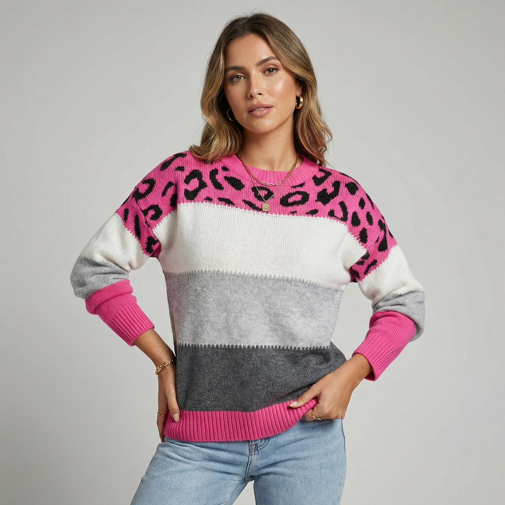 Leopárd Mintás Konstrast Pulóver